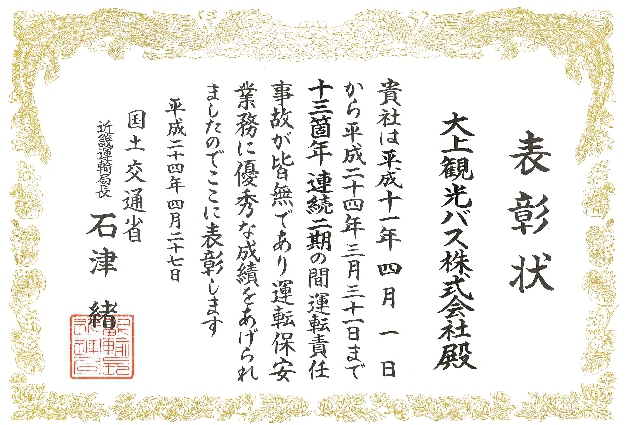 国土交通省近畿運輸局長より、二期連続十三年間無事故表彰を受賞。
