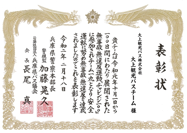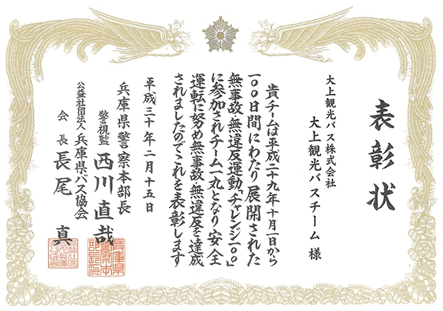 兵庫県警察本部長、兵庫県バス協会会長より、無事故・無違反運動「チャレンジ100」達成の表彰を受賞。